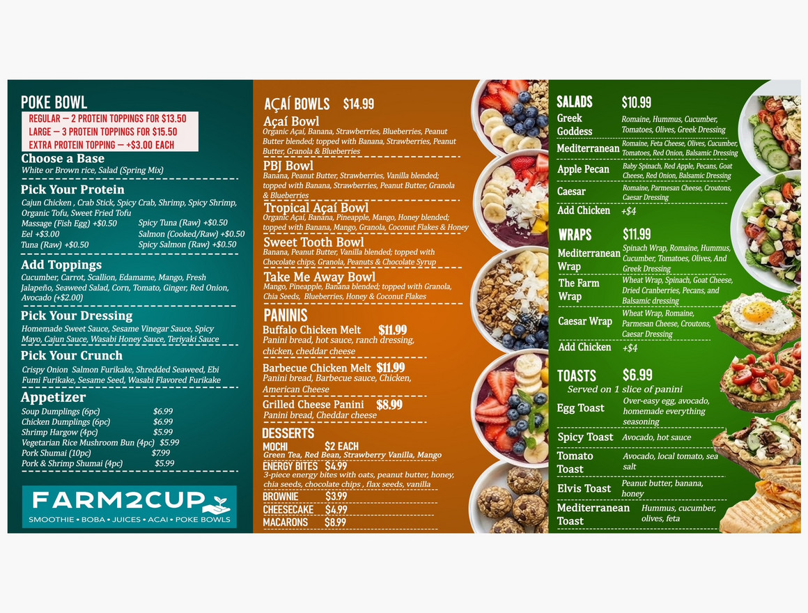 We offer a variety of healthy options, including Smoothie, Boba, Juices, Acai, Poke Bowls, Wraps, Salads, Paninis, Seasonal Soups, and Juice Cleanses. If it's beneficial to your well-being, you'll find it here.