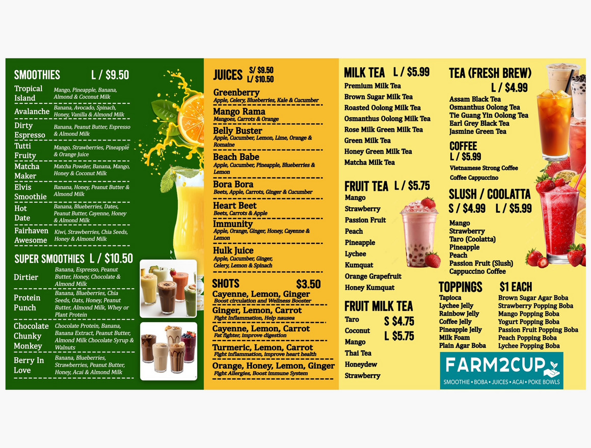 FARM2CUP was founded with a deep commitment to health and wellness. The owner aimed to introduce something fresh and vibrant to the community, while also uplifting local businesses. Every piece of produce we use is sourced from nearby farmers markets. We carefully select each ingredient to ensure our products are crafted with care and packed with everything you need to feel your best.